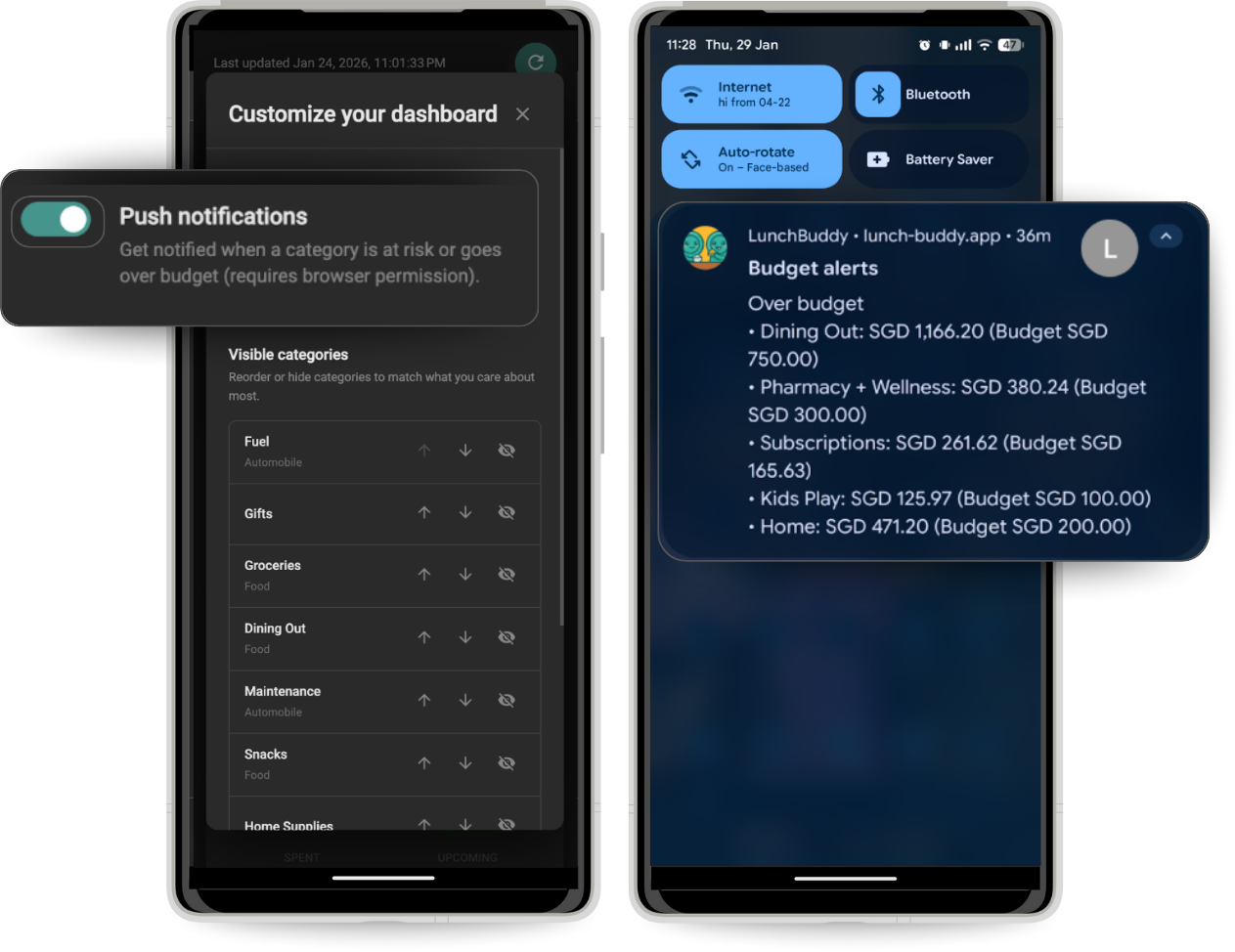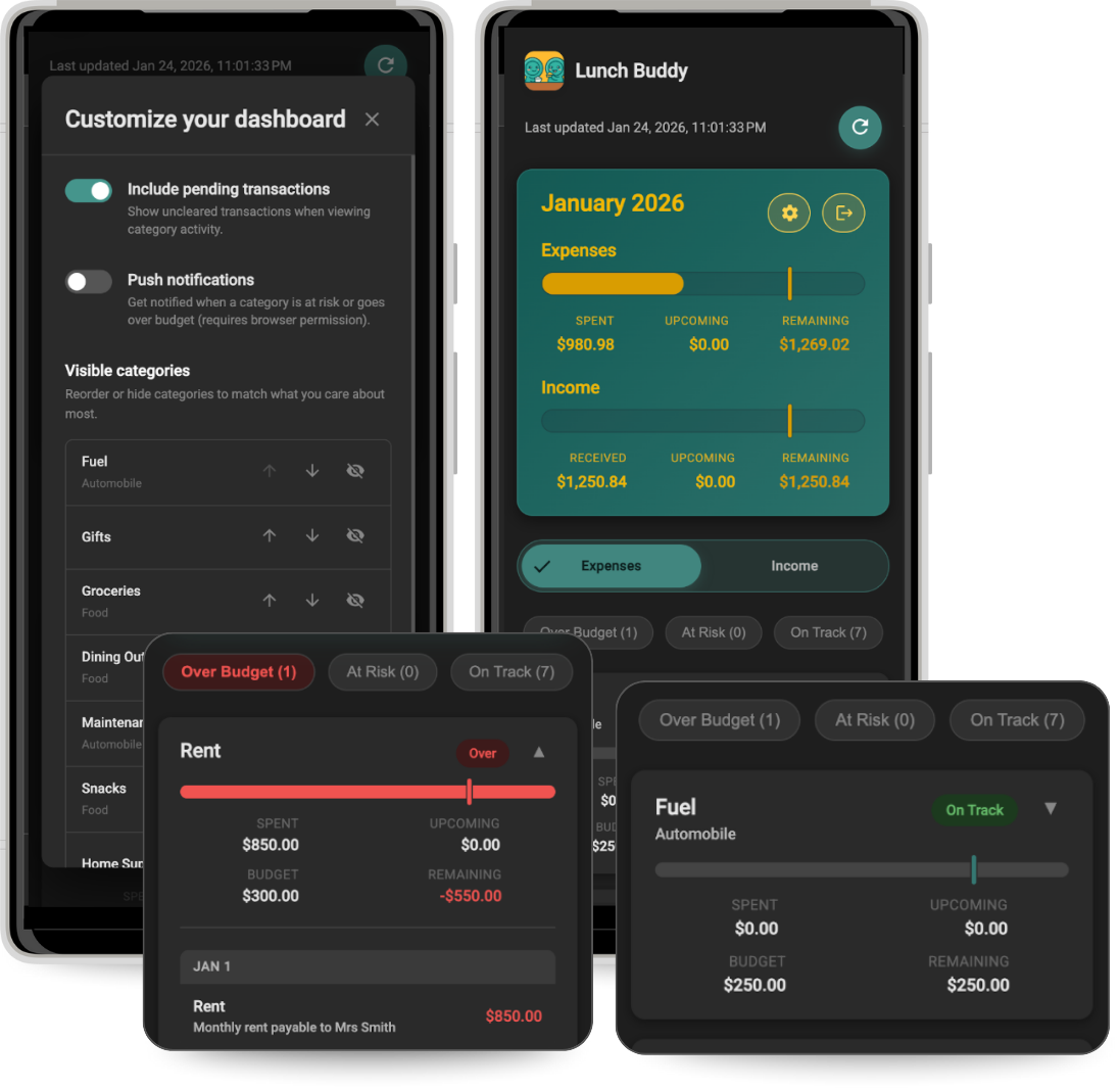 Lunch Buddy is a lightweight companion app that lets you quickly check your budget status on your phone. It’s intentionally simple: a quick answer to “how are we tracking this month?” You can even get optional notifications when a category goes over budget.