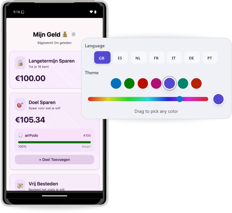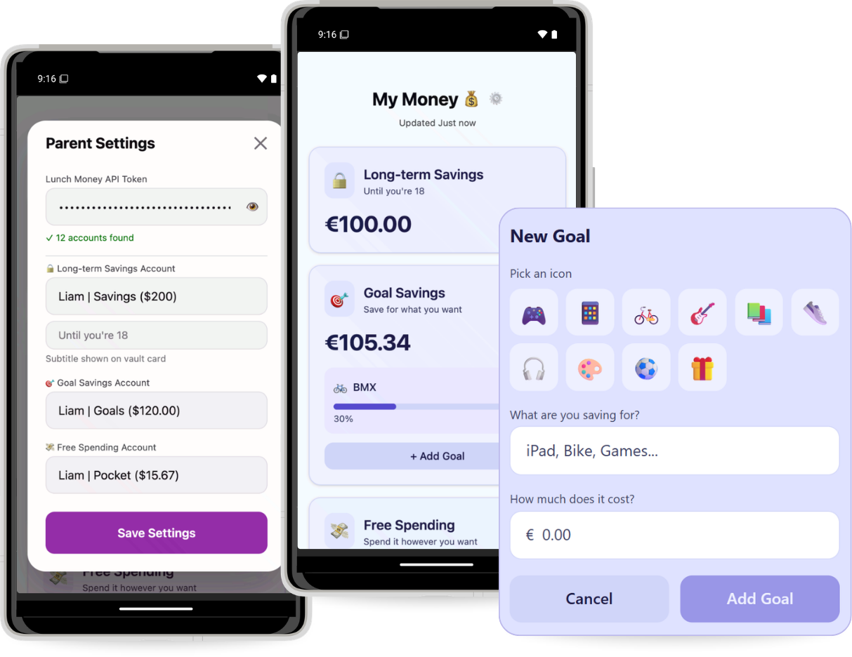 The app lets kids see and manage their money in three simple buckets: long-term savings goals, saving for something specific, and fun money they can spend however they like.